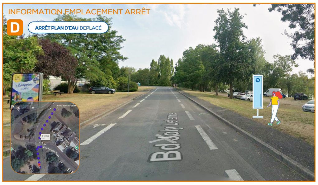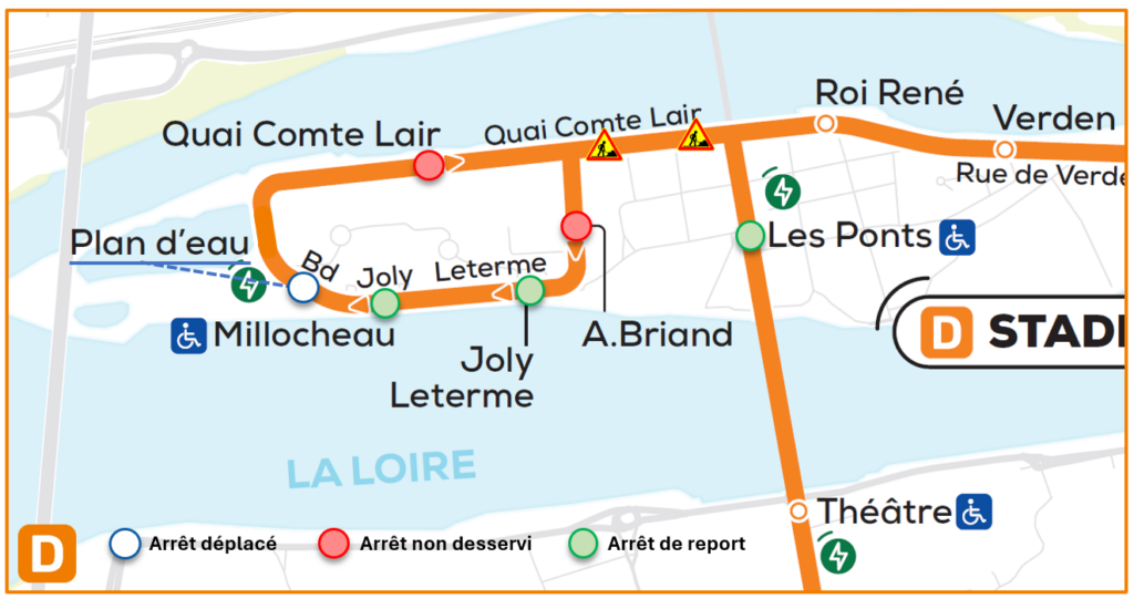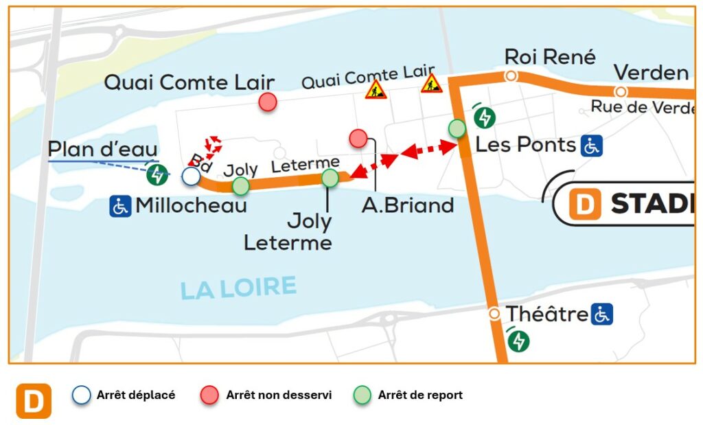 En raison de travaux de terrassement sur le Quai Comte Lair à compter du 2 mars 2026, la ligne D sera fortement impactée. Les arrêts QUAI COMTE LAIR et A. BRIAND ne seront pas desservis à partir de cette date. De plus l’arrêt PLAN D’EAU sera déplacé de quelques mètres.