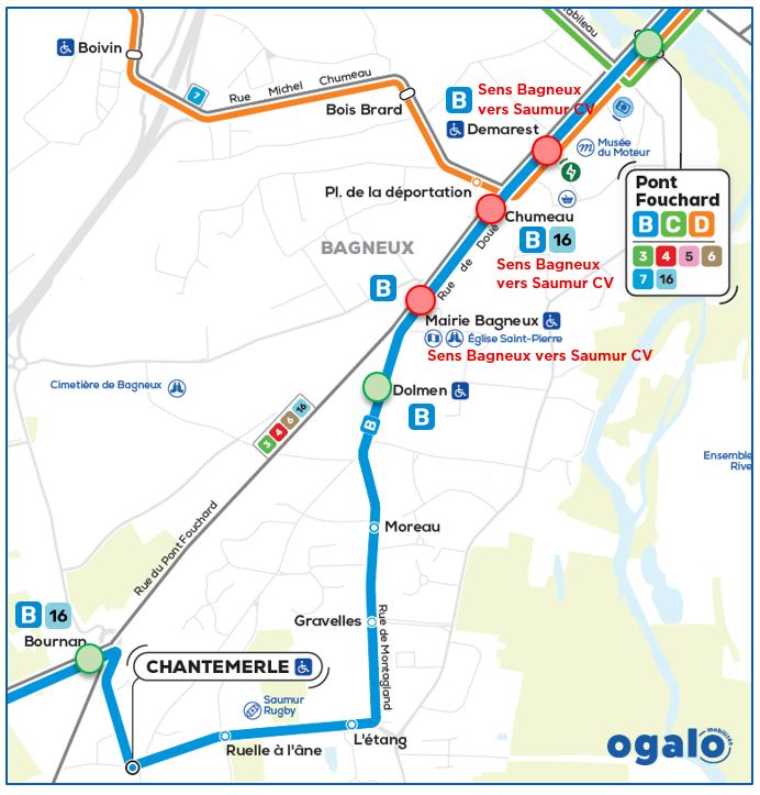 • Ligne B : les arrêts MAIRIE DE BAGNEUX, DESMAREST et CHUMEAU ne seront pas desservis uniquement dans le sens Bagneux vers Saumur (Centre-Ville). Nous recommandons aux usagers d’emprunter les arrêts DOLMEN ou PONT FOUCHARD.